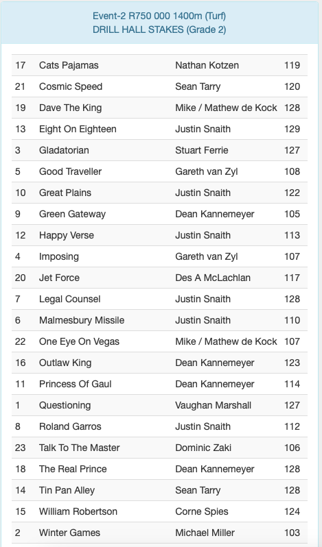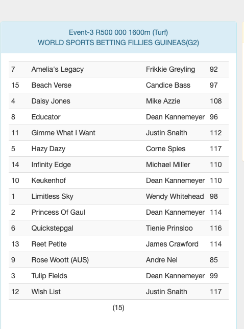 ENTRIES WORLD SPORTS BETTING KZN GUINEAS DAY